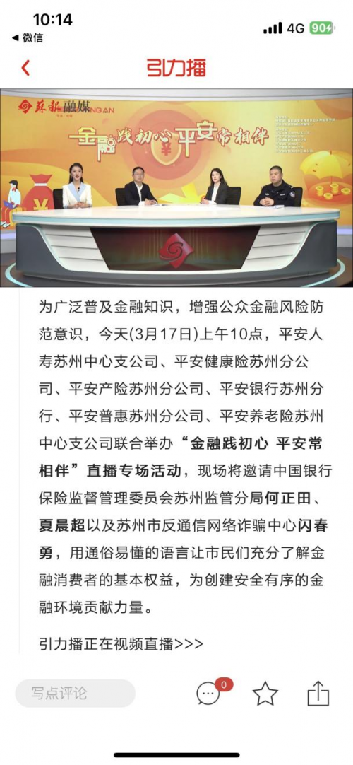 目前,平安蘇州地區(qū)六家專業(yè)公司在蘇州日報(bào)引力播APP平臺線上舉辦了“金融踐初心 平安常相伴”直播主題活動(dòng)。直播邀請到中國銀行保險(xiǎn)監(jiān)督管理委員會蘇州監(jiān)管分局何正田、夏晨超以及蘇州市反通訊網(wǎng)絡(luò)詐騙中心閃春勇,用通俗易懂的語言讓市民們充分了解金融消費(fèi)者的基本權(quán)益、反詐知識,守護(hù)好自己的錢袋子。直播觀看人數(shù)達(dá)11.2萬人。