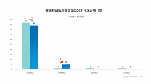 地區(qū)層面,賽迪科創(chuàng)獨(dú)角獸百強(qiáng)(2023)分布不平衡態(tài)勢依然突出,東部地區(qū)占88家,中部地區(qū)占10家、西部地區(qū)占1家,東北地區(qū)占1家,與上一年相比,中部地區(qū)增長最多,增加8家,東部地區(qū)則有所降低,但仍處于絕對領(lǐng)先地位。