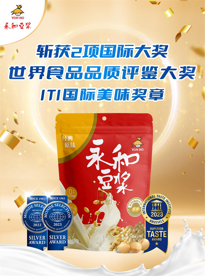 永和豆?jié){一路走來,不斷追求卓越品質,積極對標嚴格的國際標準,打造營養(yǎng)美味的豆?jié){產品。2022-2023年,永和豆?jié){旗下經典原味豆?jié){粉350g憑借專業(yè)配方和匠心工藝,連續(xù)斬獲蒙特獎和ITI國際美味獎,閃耀世界舞臺。